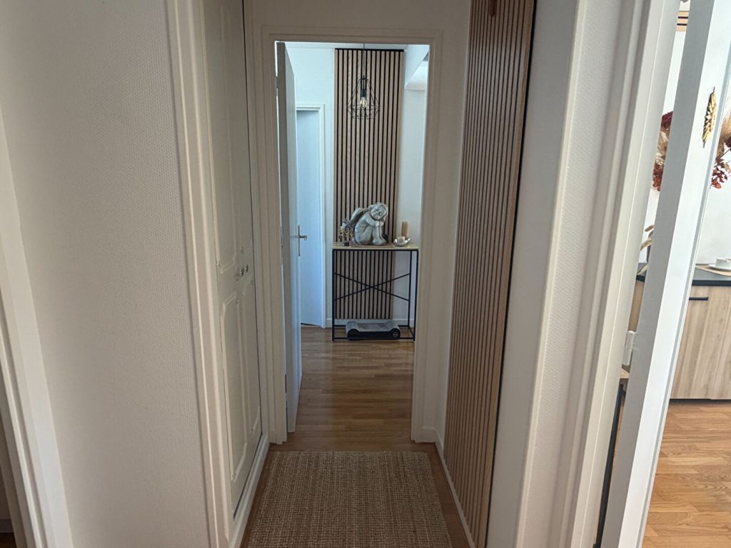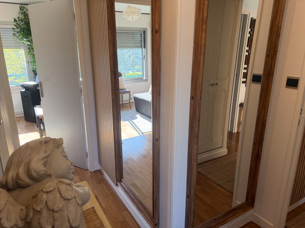 La cuisine, récemment aménagée et équipée (lave-vaisselle, four, plaque, hotte), donne également accès à un balcon avec fenêtres coulissantes. Deux chambres, une salle de bains et wc indépendants, de nombreux placards à disposition, salon, chambre, entrée.