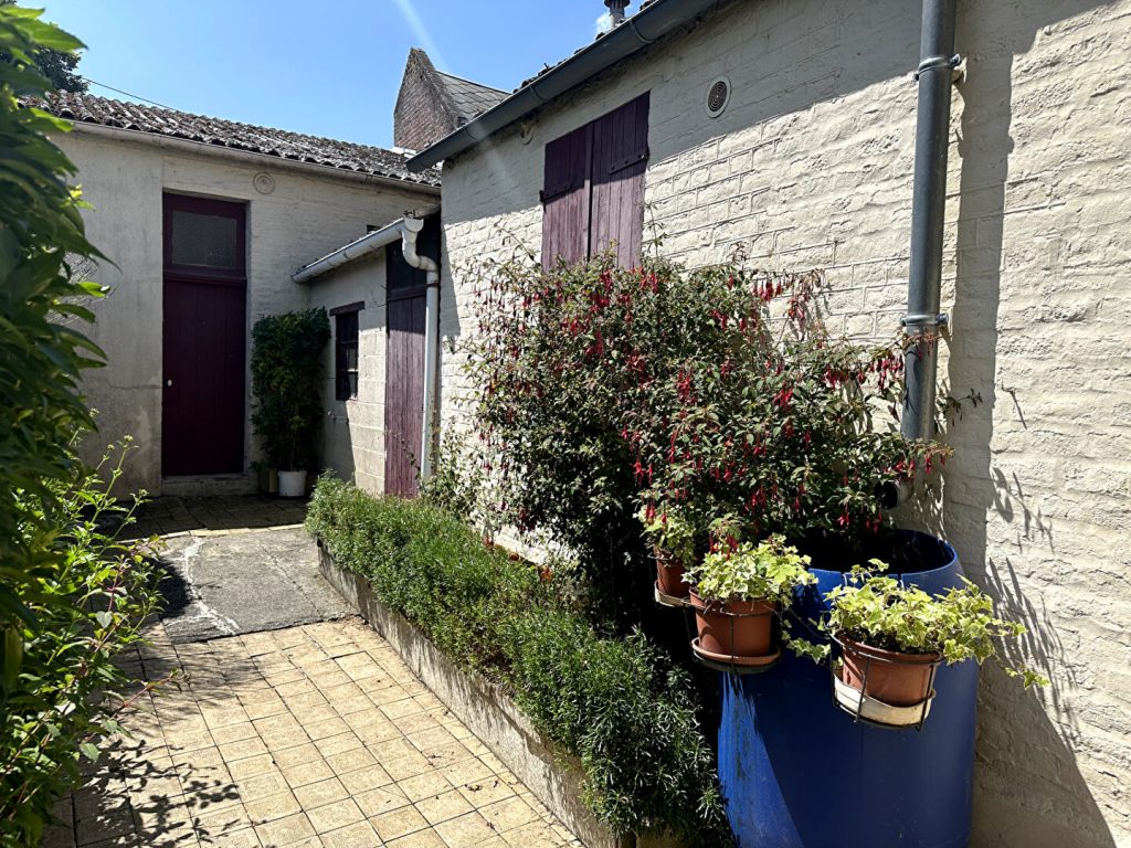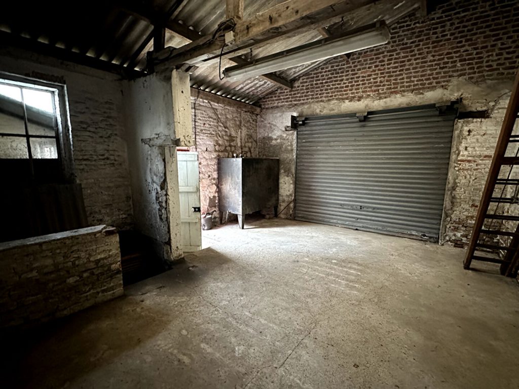 une maison en bon état avec un grand garage avec rideau métallique, une cour et un atelier.