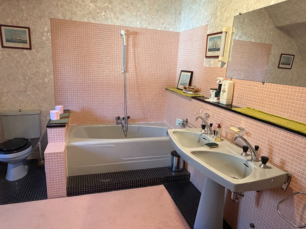 une grande entrée, un salon avec cheminée à foyer ouvert, une salle à manger donnant accès à une véranda avec vue sur le jardin et la pâture, une cuisine, une grande arrière-cuisine, une chambre avec salle de douche, un WC indépendant avec point d’eau. A l’étage, un long couloir dessert : 4 chambres spacieuses, une grande salle de bains avec WC, un grenier.